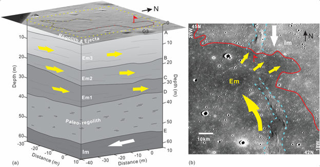 先前研究认为,雨海北部年轻的爱拉托逊纪月海物质(Em)仅仅由一期厚熔岩流形成。近些年,通过摄影测量、陨石坑大小频率分布以及陨石坑穿透深度等方法发现,雨海北部Em厚度变化较大,推测在某些区域可能存在不可见的熔岩流。此外,Robinson等人也发现月海喷发物通常产生一系列10米厚的熔岩流,而不是数十米到数百米厚。前期测月雷达研究中,由于受到通道一数据质量和通道二探测深度的限制,月壤所覆盖的浅层Em结构没有得到很好的约束。