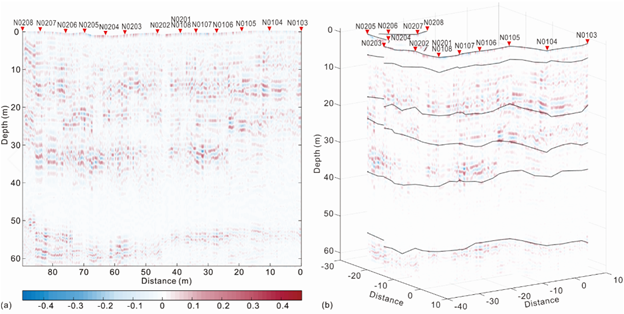 图1 (a)处理后的测月雷达通道一数据;(b)沿测线投影的雷达数据以及界面划分